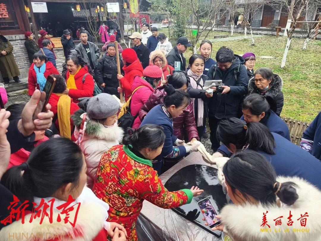 民俗园内,游客们饶有兴致地参加祭祀巡游。苗家人用古老的祈福方式,祷告祖先,祈求来年的风调雨顺、五谷丰登、六畜兴旺、安康喜乐。随后,大家还体验了古老的磨豆腐、湘西特有的蜡染和打糍粑,在实干中感受苗年独有的快乐。苗歌阵阵、舞姿翩翩,此时,德夯苗寨绘成了一片欢乐的海洋。