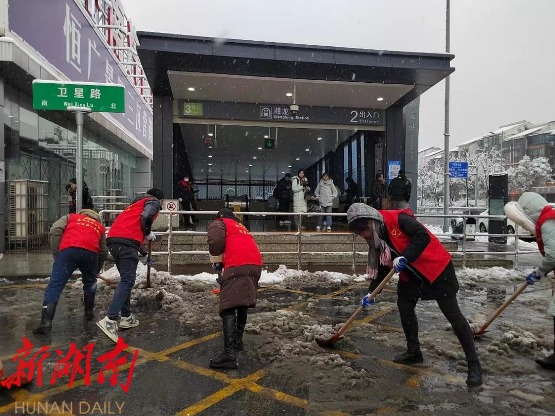 湘龙街道锦元社区组织党员、志愿者、楼栋长在地铁站湘龙站开展铲雪除冰的志愿活动。锦元社区供图