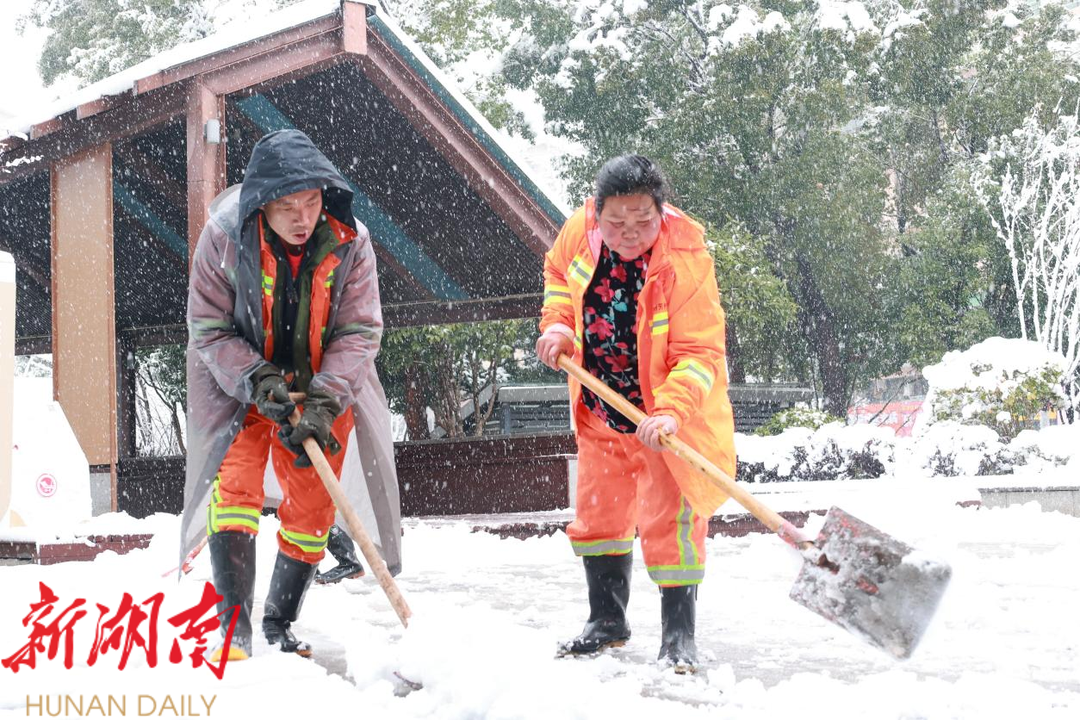 一大早,湘龙街道暖心环卫大姐刘爱明和同事们清扫公园道路积雪,保障居民安全出行。周靓 摄