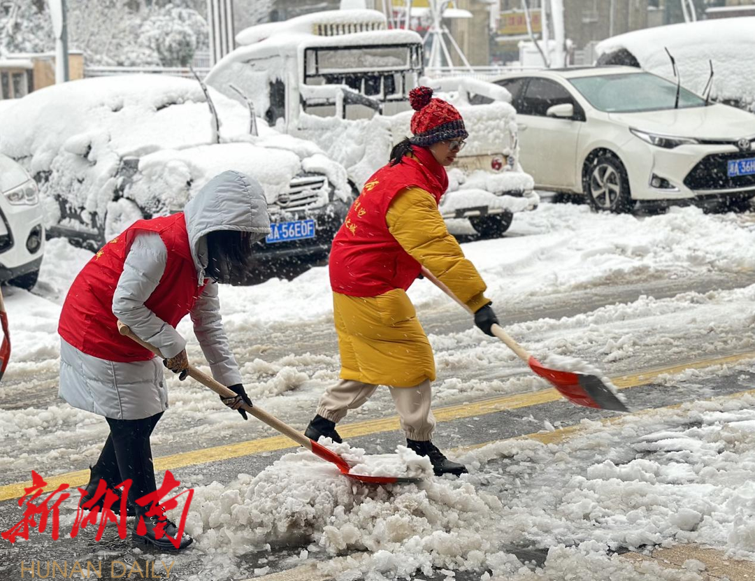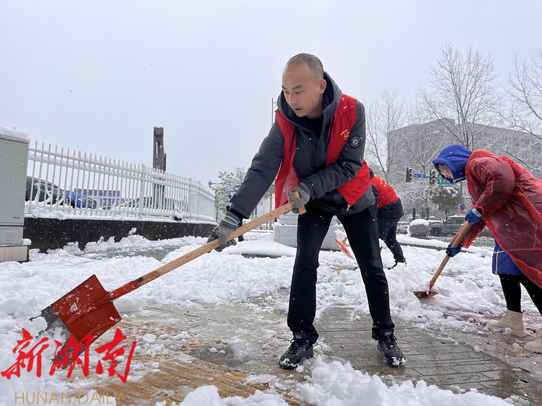 可以看到,在湘龙街道主次干道、桥梁等交通要道上随处可见党员干部、网格员、志愿者、环卫工人的身影。不少市民、商家也加入其中,虽然寒风凛冽、寒气逼人,但大家“浴雪”奋战,挥锹扬铲,干劲十足,风雪中的一抹亮色格外温暖、鲜艳。