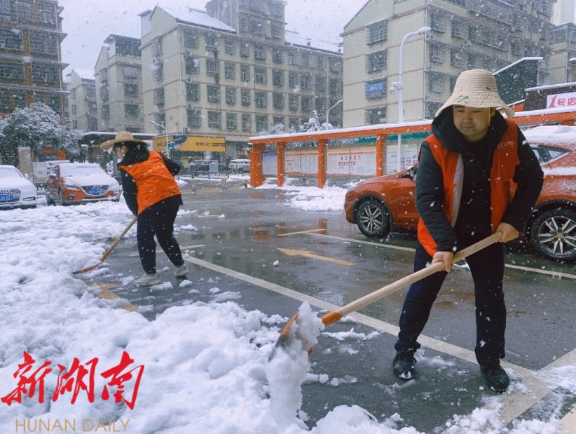 在湘龙街道潇湘路社区经商的新疆商户列提普·图热再披“红马甲”,手拿铁锹,奋力铲雪,为保障居民出行安全献上一份力量。