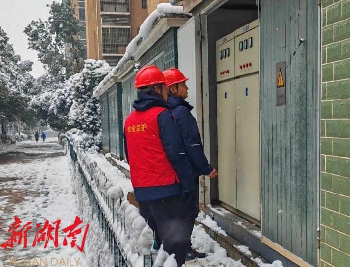 1月22日上午,长沙县经开区供电服务站积极迎战恶劣天气,工作人员在楚天世纪城小区巡视电力设备运行情况,确保设备正常运行,全力保障电力供应,守护万家灯火。