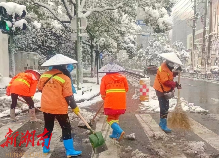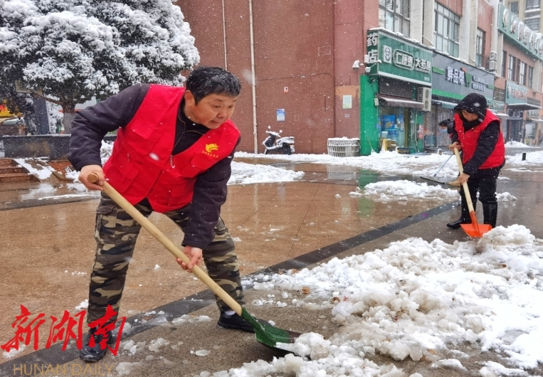 1月22日下午,江苏华君物业湖南分公司环卫工人正在天华南路铲雪除冰。“这一带积雪多,交通流量大,我们再加把劲,希望大家经过的时候能更安全放心。”正在铲雪的环卫工人表示。