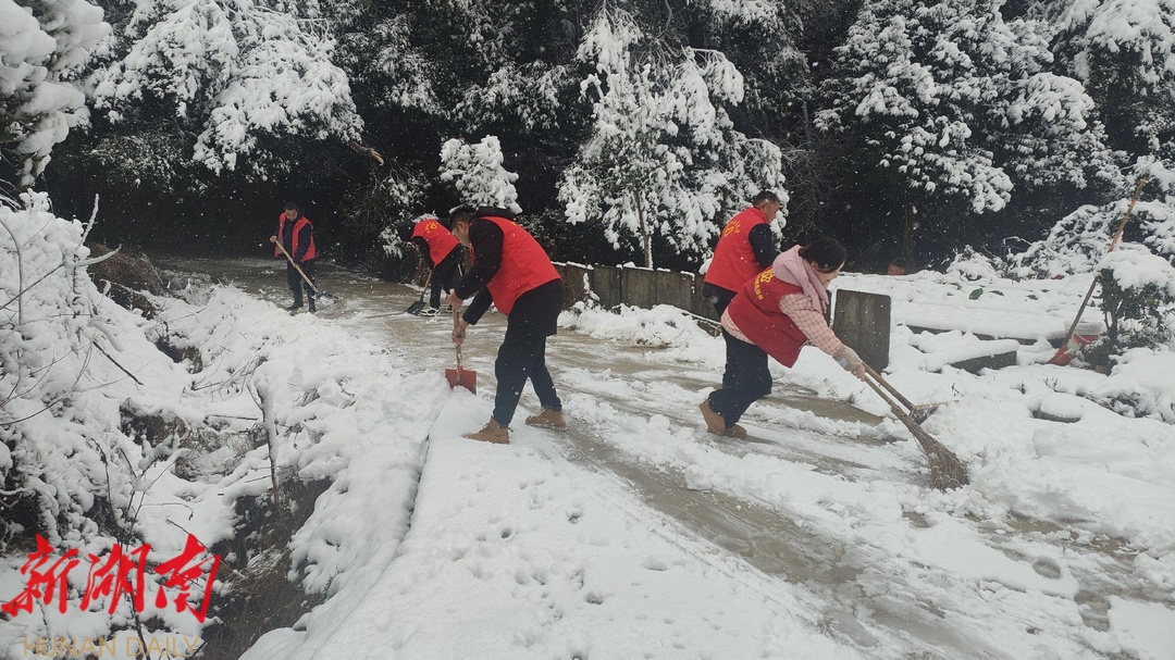 “落大雪了,树枝都压断了。”22日一大早,黄桥村的陈陵德、陈正乾、李蛮、黄志桂、罗热新、陈平、陈星瞳、蒋伟斌等党员、群众自发组成除路障保平安队伍,清理六组坟至洲沙坝沿线约2公里路段的积雪和树枝,确保乡道畅通。