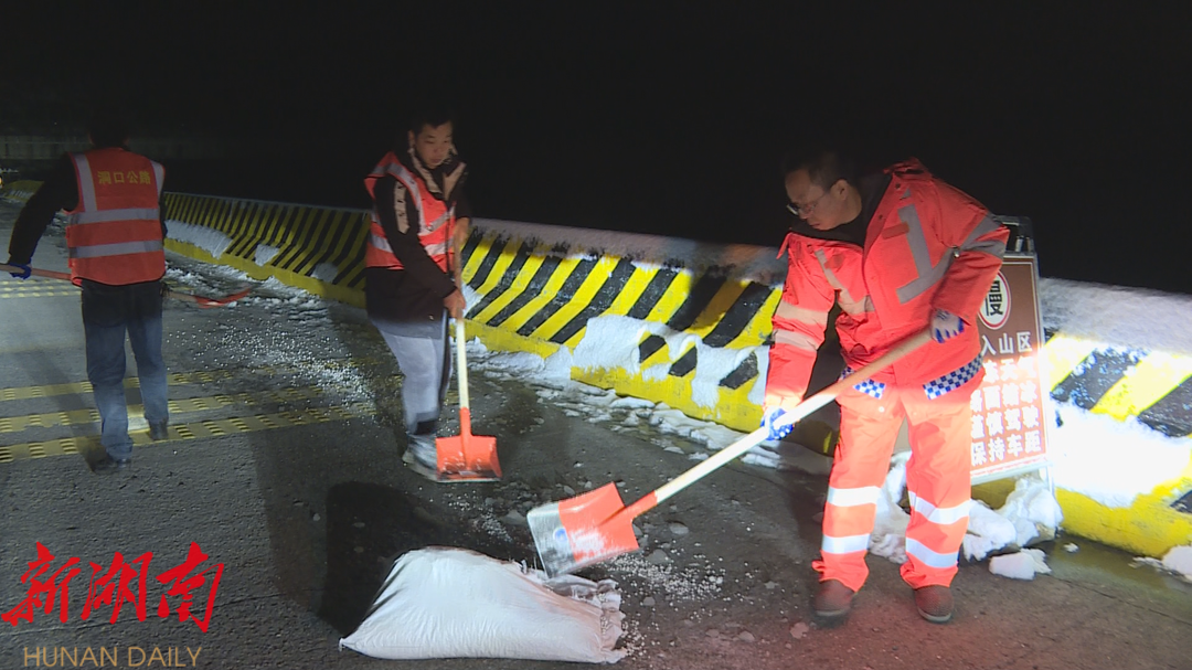 在320国道古楼乡路段,公路养护人员根据往年的抗冰除雪经验,在桥梁、急弯、陡坡等路段,先用铲子清除路面主要积雪,再将提前准备的融雪剂抛洒到路面上,减轻路面结冰状况,同时,清理路边倒伏树木,确保过往车辆顺利安全通行。