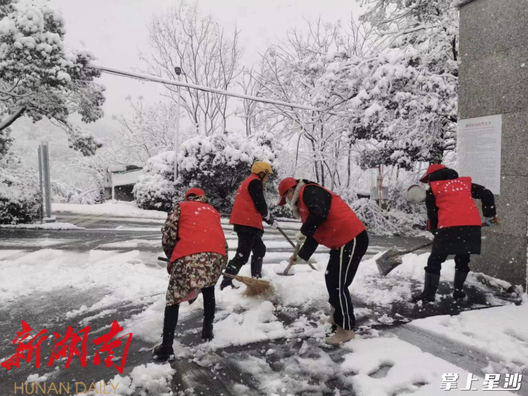1月21日深夜开始飘雪,至22日清晨,全城被厚雪覆盖。当很多居民还在暖和的被窝里,长沙县各级新时代文明实践志愿服务队和居民志愿者们已走上街头,纷纷挥起铁锹、扫帚开展扫雪清障志愿服务活动。