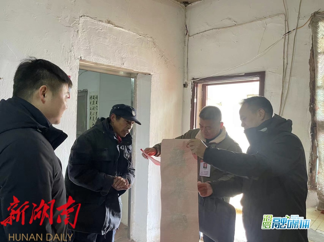 岳阳市人民检察院党组成员、政治部主任陈敏辉(右一)走访脱贫户,为其送去春联