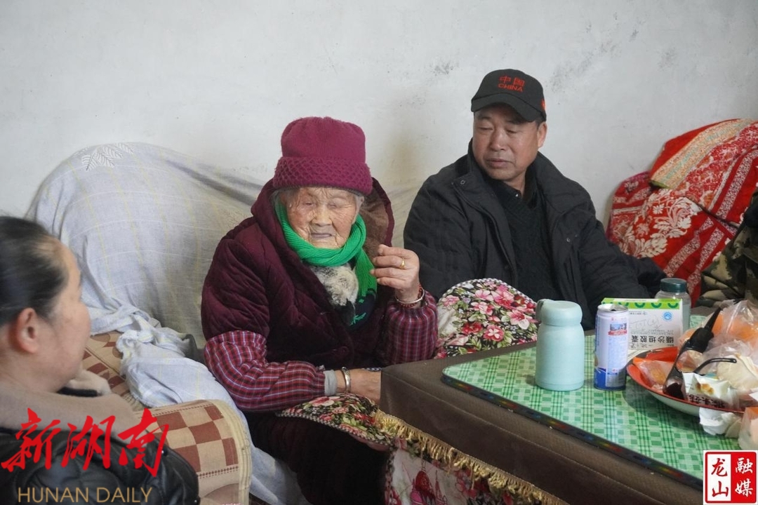 龙山县石羔街道尧坪村6组的包子云老人今年刚满101岁,听说有人要来看望她,便早早地站在二楼阳台等候,大家赶到时,就看见老人家在二楼笑呵呵地对大家招手。