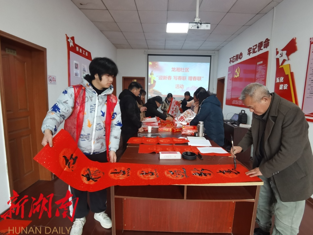湖南日报·新湖南客户端1月25日讯(通讯员 林畅 颜慧婕)岁末年关,春节临近。为浓厚节日氛围、让群众感受来自社区的温暖与关爱,1月25日,长沙县长龙街道龙湘社区新时代文明实践站开展“寒冬岁末·温暖相伴”迎新春、写春联、赠春联活动,特邀本地书法爱好志愿者挥毫泼墨,为辖区居民写春联、送祝福。