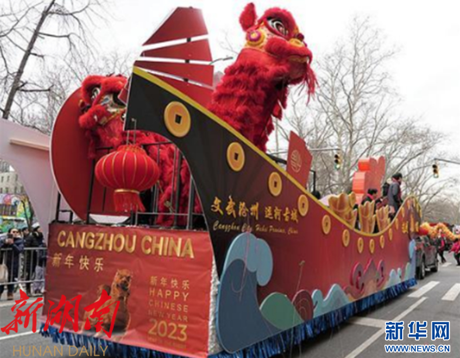 “真没想到还有这么美丽的花车,它就像一艘扬帆起航的轮船。”在美国纽约时间2023年2月12日举行的纽约新春大游行文化节上,“文武沧州,运河古城”主题花车作为头车带领古运河文化“扬帆出海”。大运河、铁狮子、舞狮等沧州文化元素引得海外观众频频喝彩并按下快门键。