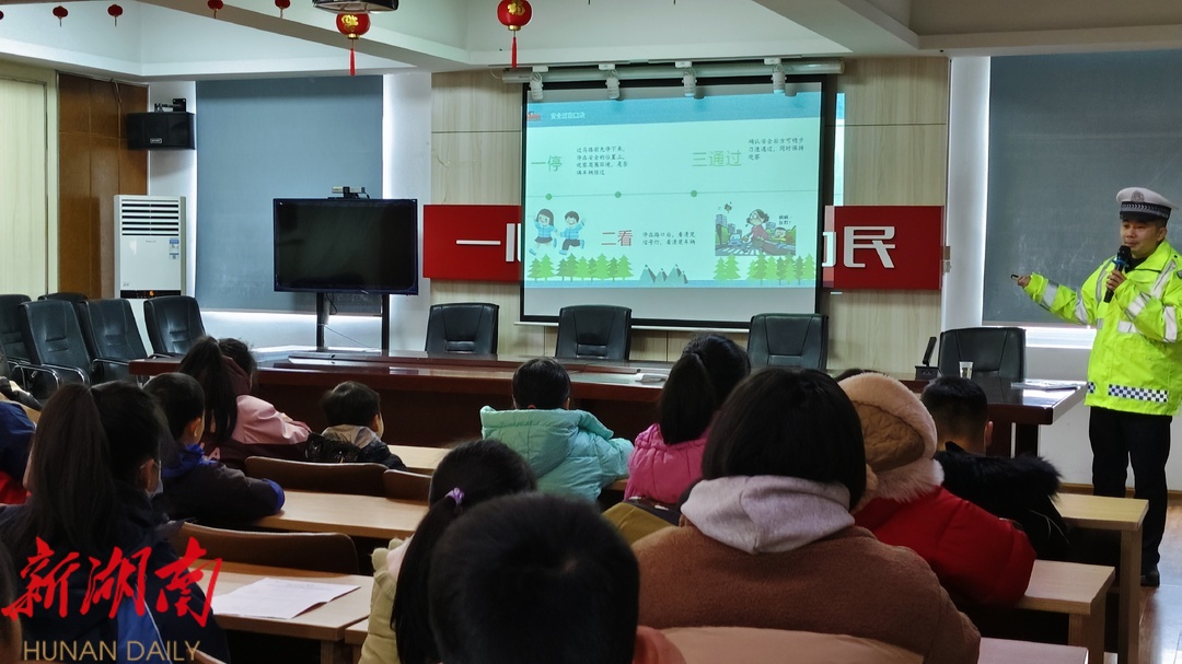 “同学们,快乐的寒假已经到来,大家知道放假期间的交通安全出行注意事项吗?”活动现场,彭警官根据社区、校园周边道路交通情况,用通俗易懂的语言为学生讲解交通安全知识,采用“视频+问答”的互动方式,详细讲解出行安全、信号灯判断、乘车安全等,倡导全体同学要自觉遵守交通规则,养成良好的出行习惯,做到守法规,知礼让,安全文明出行。