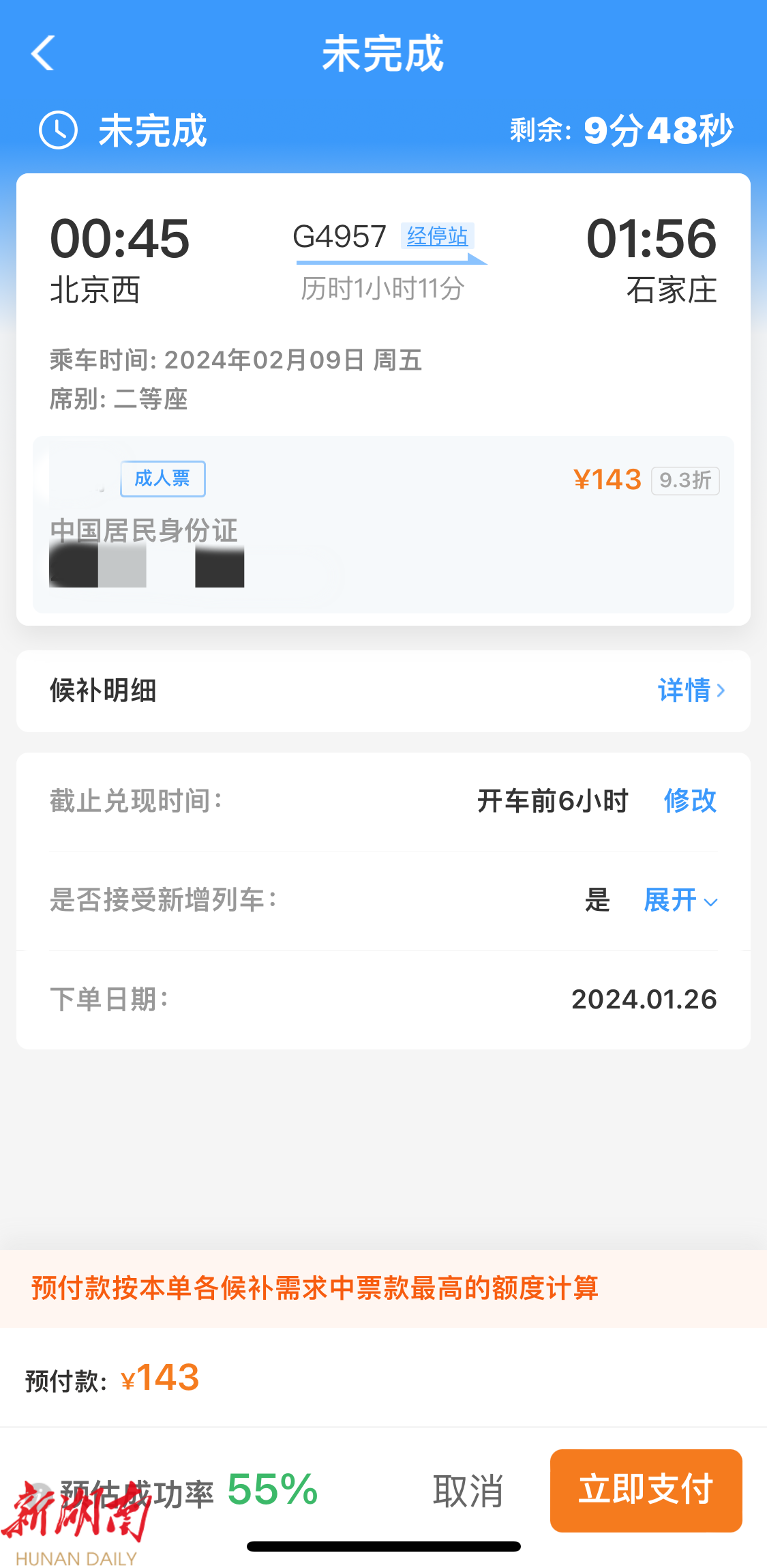 最后,确认基本信息无误就可以支付了,等待“候补车票”兑换成功!