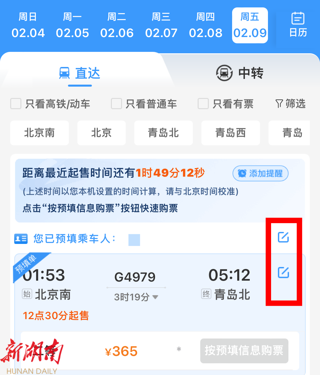 开抢前→“购票信息预填”,无需像以前必须等到车票发售的时候才能选乘车信息,这次可以在起售时间前填好乘车人、车次、席别等信息,信息“秒提”,主打一个手快!