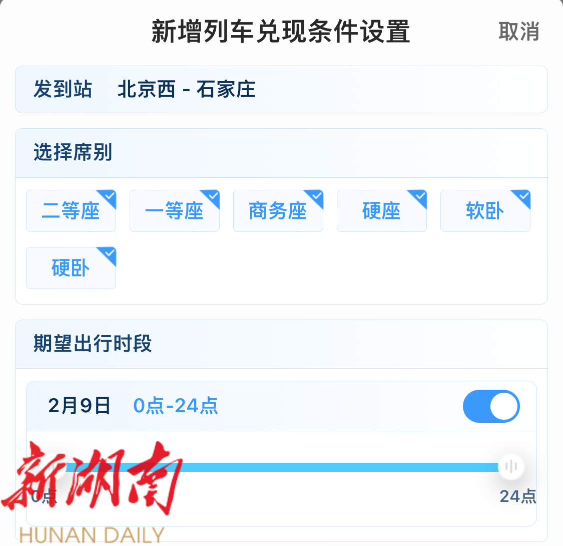 打开之后,设置兑现条件,选择席别和期望出行的时段。要领→席别全选、时间拉满。