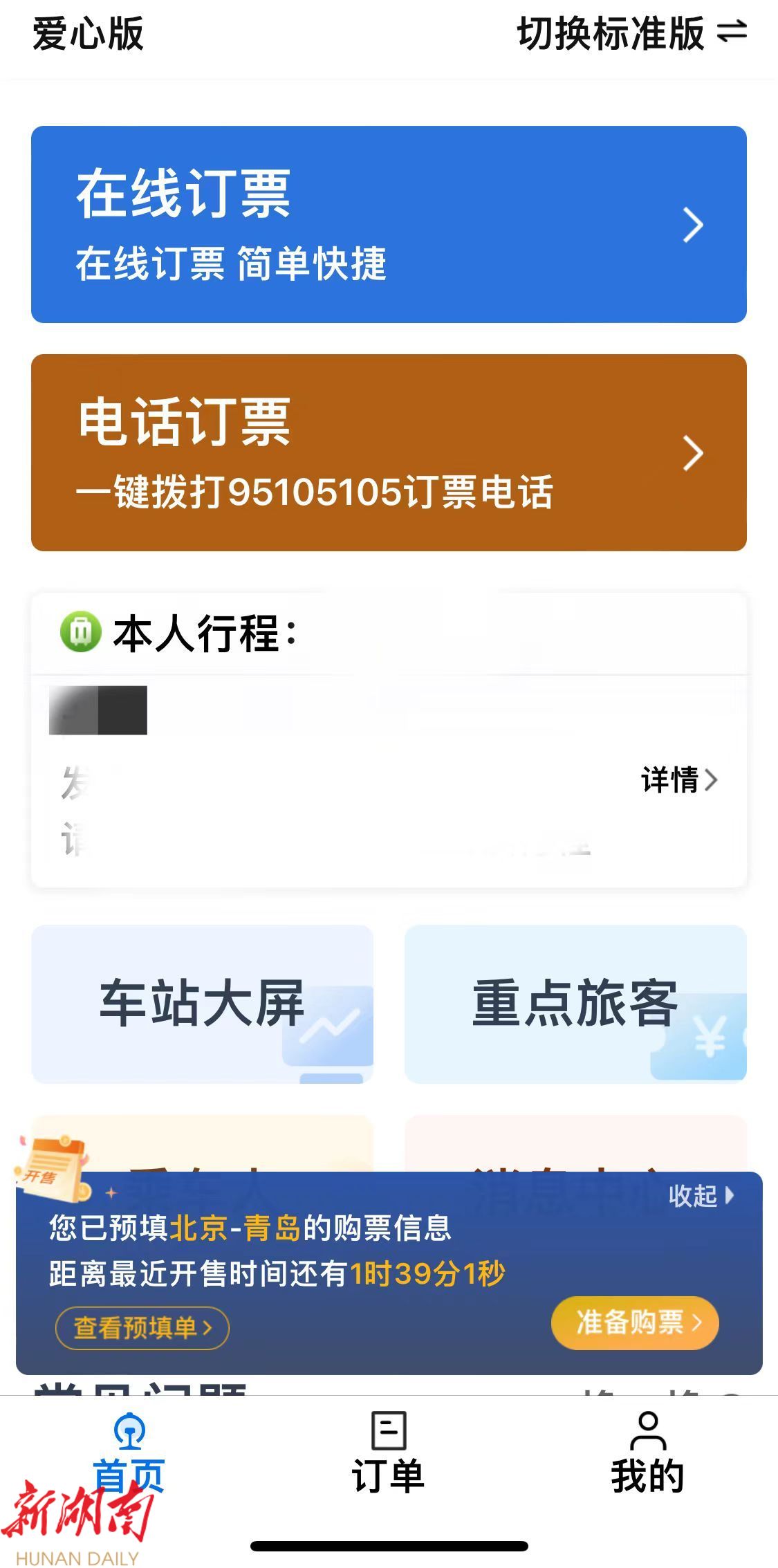 字体和图标更大,功能更简洁,还增加了一键拨打电话的订票功能,家里有老人的用起来。