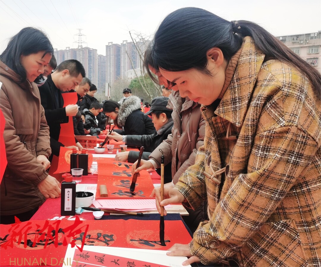 与此同时,书法老师们在一旁摆开书案,铺开红纸,笔走龙蛇泼墨挥毫,写下一幅幅“福气满满”的春联,吸引众多居民挑选。