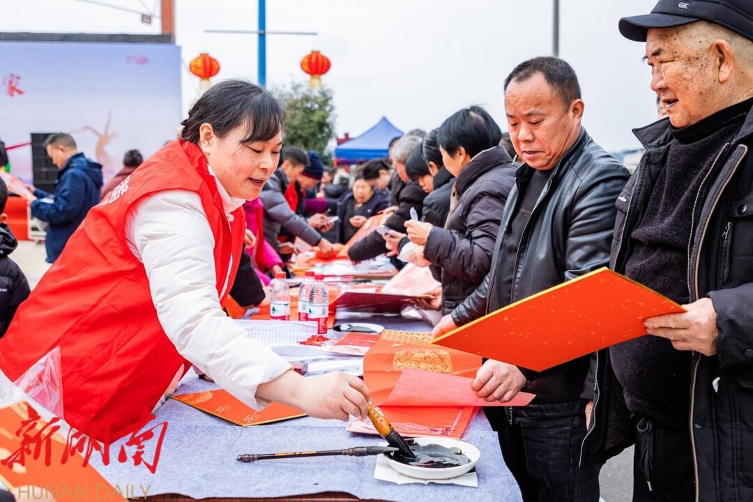 【送福气】来自长沙市群众艺术馆的书法老师现场为村民手写对联及福字,村民们开心地说:“还好我今天来了,不然就亏大发了。”
