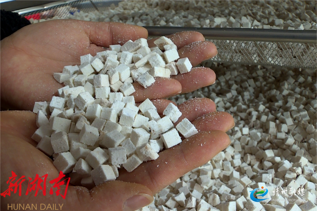 在靖州康源苓业科技股份有限公司,生产车间内也是一派繁忙景象。工人们将新鲜出土的茯苓手动削皮去泥后,加工成茯苓丁、茯苓片、茯神等不同品类。工人们还将前期制作好的茯苓面条进行包装,准备发往邻县40多个销售网点。
