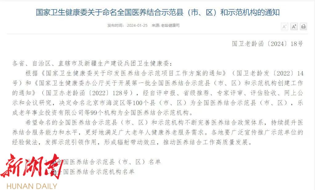 近日,国家卫生健康委发布《关于命名全国医养结合示范县(市、区)和示范机构的通知》,经自评申报、省级推荐、专家评审、评估验收、网上公示和会议研究,决定命名100个县(市、区)为全国医养结合示范县(市、区),99个机构为全国医养结合示范机构。其中,长沙县荣获“全国医养结合示范县”称号。