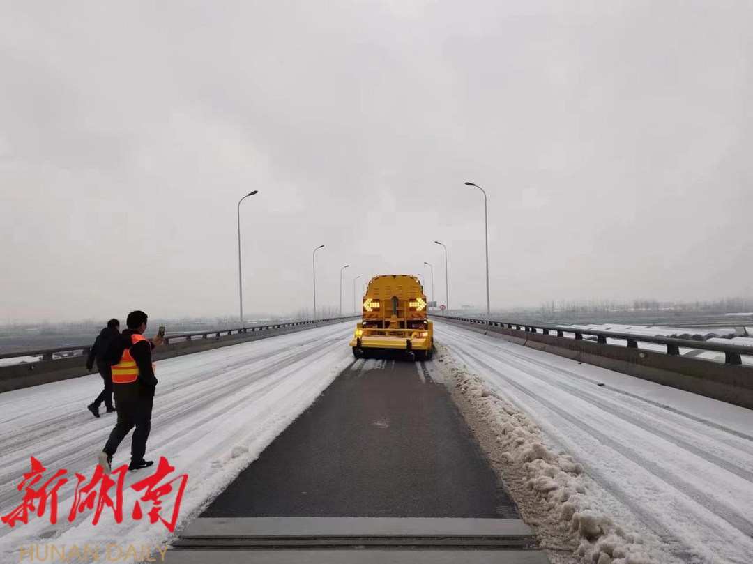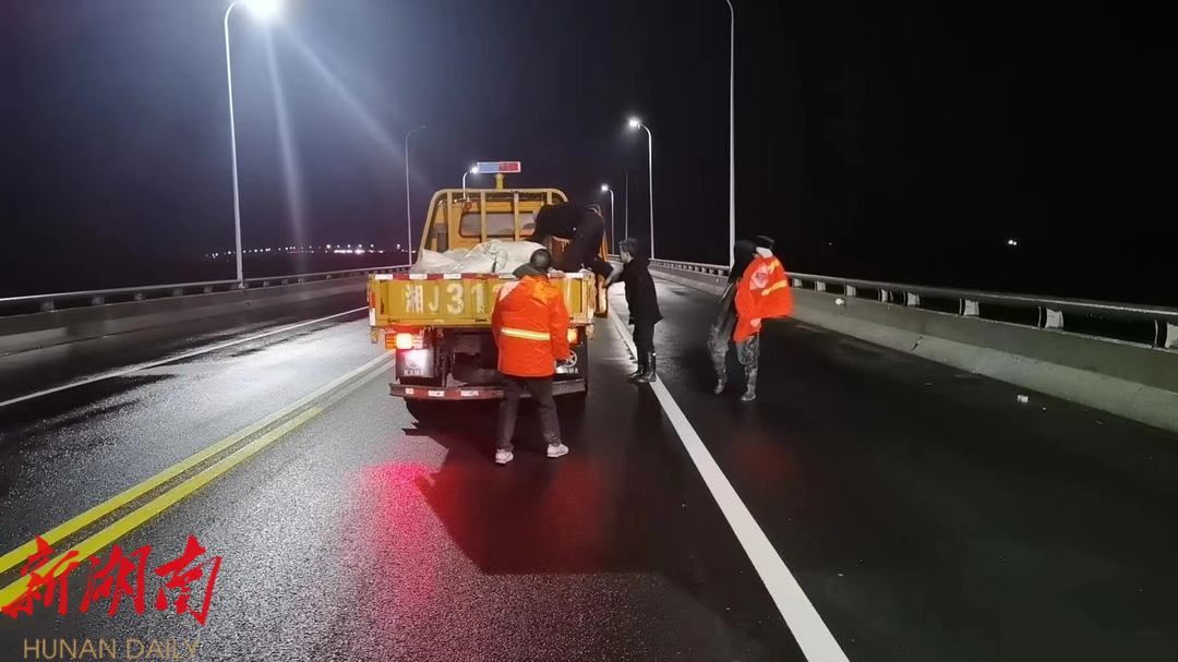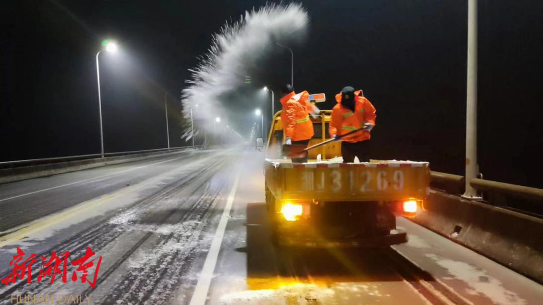 汉寿县公路建设养护中心立即启动应急预案,迅速组织应急人员对沅水大桥开展融雪除冰保畅工作,撒布融雪剂近12吨。