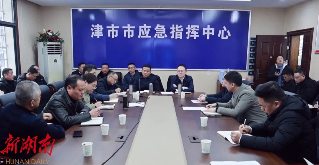 2月5日下午,常德市低温雨雪冰冻灾害防御工作视频会商会召开,津市设分会场收听收看。市委书记黄旭峰,市委副书记、市长彭子晟参加会议。