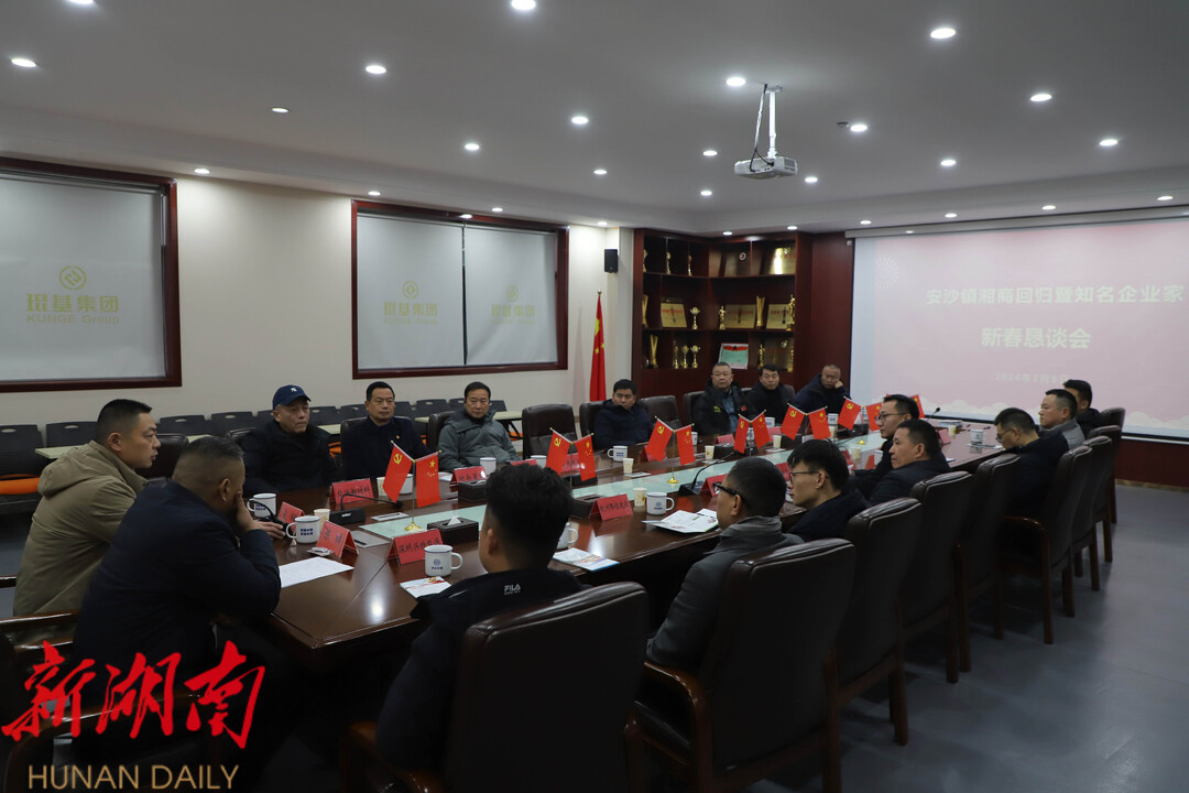 2月5日,长沙县安沙镇组织召开湘商回归和返乡创业新春恳谈会,在外安沙籍湘商代表及镇域企业代表欢聚一堂、畅叙友情、共话发展。