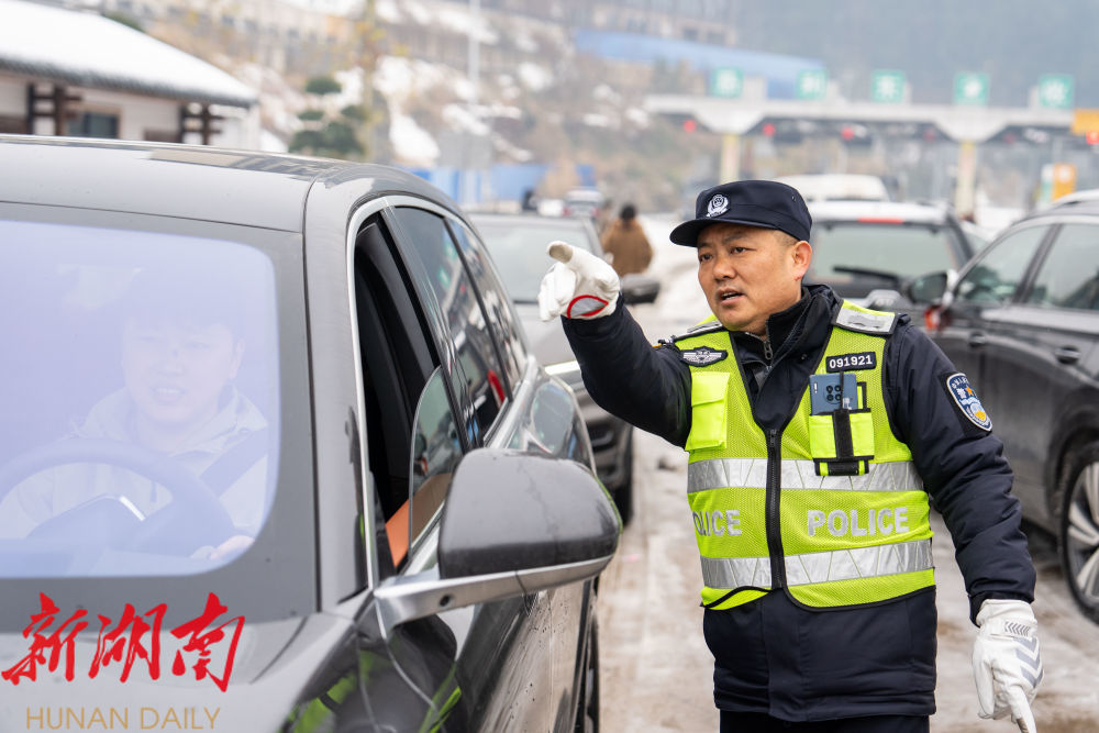 2月6日,在湖南长张高速慈利东收费站附近,交警解答滞留旅客的提问。新华社记者陈思汗摄