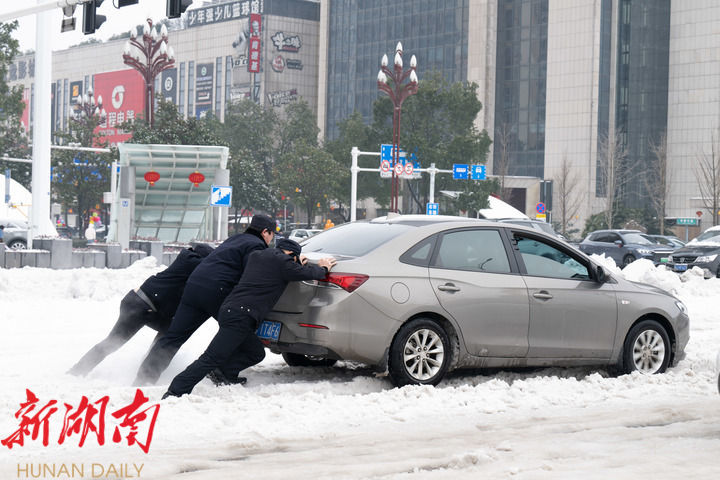 2月4日,在湖南常德火车站,武陵公安分局站前派出所民辅警帮助打滑车辆脱困。新华社发(蔡文龙摄)