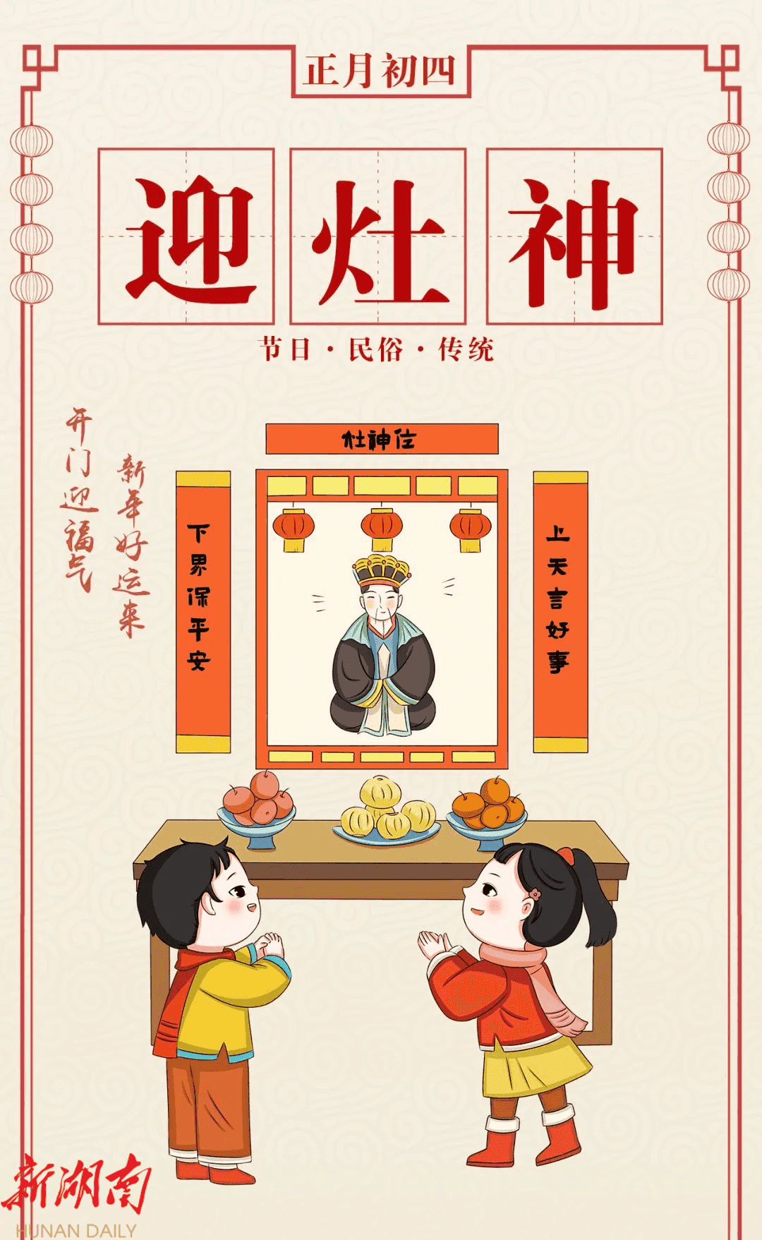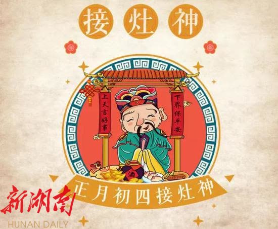 十二月廿四日就是灶神离开人间,上天向玉皇上帝禀报一家人这一年来所作所为的日子,所以家家户户都要“送灶神”。而到了大年初四,就要“迎灶神”,把“灶神”迎回来哦。按照民间的说法,正月初四灶王爷要点查户口,所以家家户户都要守在家里,准备丰盛的果品,焚香点烛并释放鞭炮,以示恭迎。