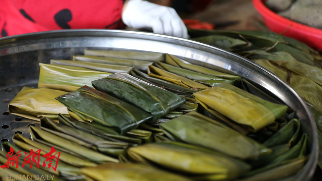 分好段后的面团放在案板上,两片粽叶为底,再用一片粽叶包裹,一个方方正正的蒿子粑粑就做好了,最后将包好的蒿子粑粑放入笼屉中蒸熟,两个小时后,软糯清甜的蒿子粑粑便出炉了。