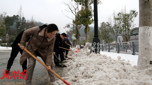 武陵源区委书记张龚带领干部职工进行铲雪除冰。