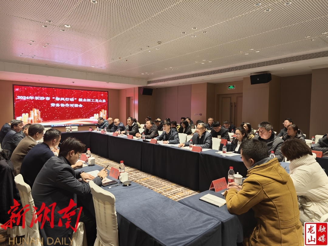 龙山县融媒体中心2月21日讯(通讯员 向明 丁浩)2月20日,长沙市“春风行动”援企招工龙山县劳务协作对接会召开。长沙市人社局党组副书记、副局长李德清,就业促进与失业保险处处长万家巍,长沙市就业服务中心副主任刘洋,综合部部长乐震、城镇就业服务部副部长李栋、公共就业服务部副部长彭娟出席会议。县人民政府副县长、长沙市对口帮扶龙山县工作组组长杜宸亿主持会议并讲话。