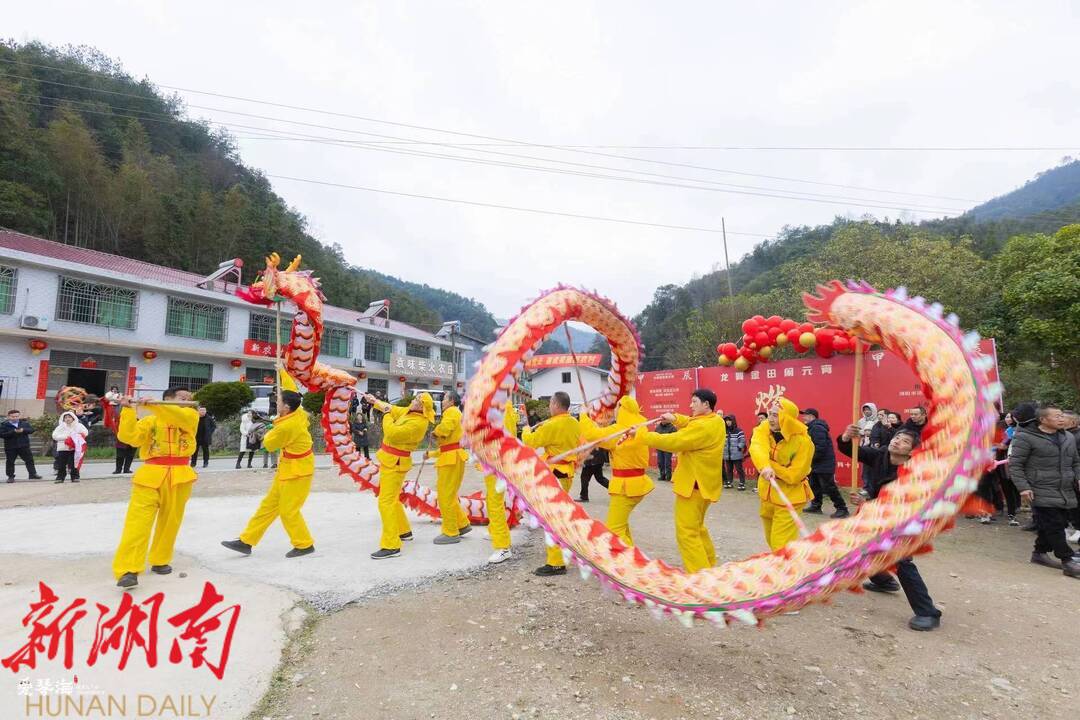 “隆咚隆咚锵、隆咚隆咚锵……”伴随着喧天铜锣声,舞龙队在大家的簇拥下走进家家户户拜年送吉祥。听到舞龙队走近的声音,村民吴友章兴奋地走到屋前点燃鞭炮迎接祥龙,左邻右舍也都聚过来争先摸龙头、讨彩头,祈愿新的一年平安喜乐、好运连连。