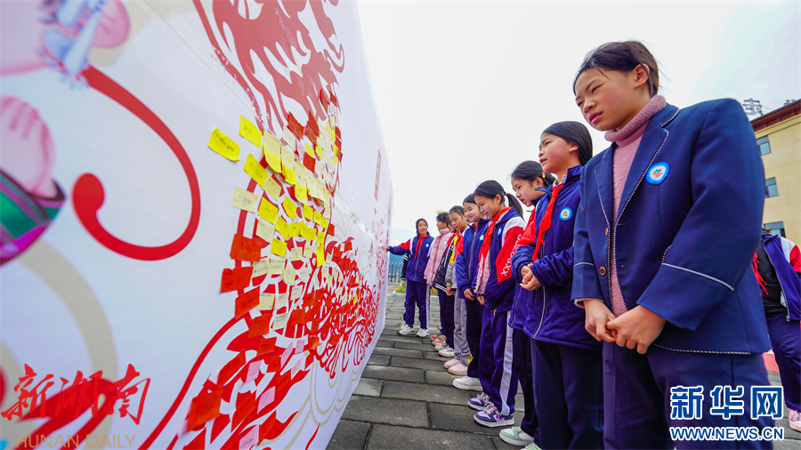 2月26日,贵州省黔东南苗族侗族自治州榕江县古州镇第四小学,举行“鱼跃龙门”“金龙送福”“贴心愿墙”等丰富多彩的活动,开启学生们的新学期新生活。新华网发(周光胜 摄)