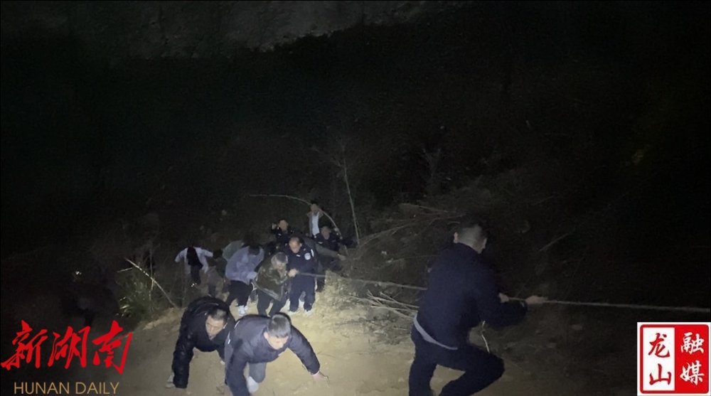 夜色中,20多个人,有的抬,有的推,有的拉,手脚并用,同时进行,边拉绳子边喊口号。“一二三、一二三……”伴随着整齐划一的口号声,齐心协力,上演生死间“拔河式”救援。
