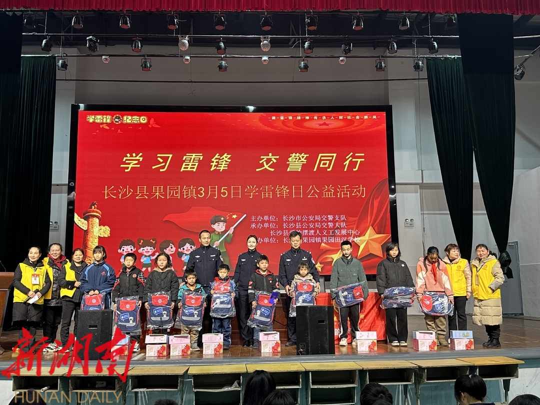 湖南日报·新湖南客户端3月6日讯(通讯员 刘露 黄可 王瑾萱)今年3月5日是第61个学雷锋纪念日,为了弘扬雷锋精神,参与志愿服务,共建文明校园与和谐社会。当天上午,长沙市公安局交警支队联动长沙县公安局交警大队与长沙县爱的摆渡人义工发展中心来到长沙县果园镇田汉学校,开展了交通安全文明出行宣讲进村校和关爱农村留守儿童公益活动。