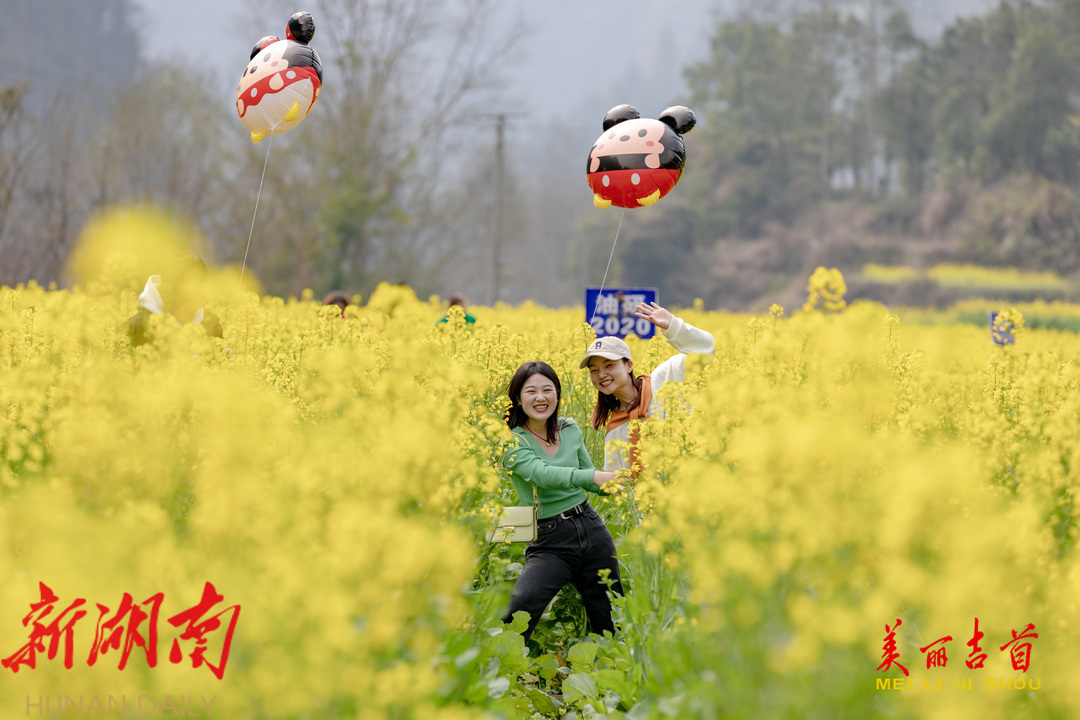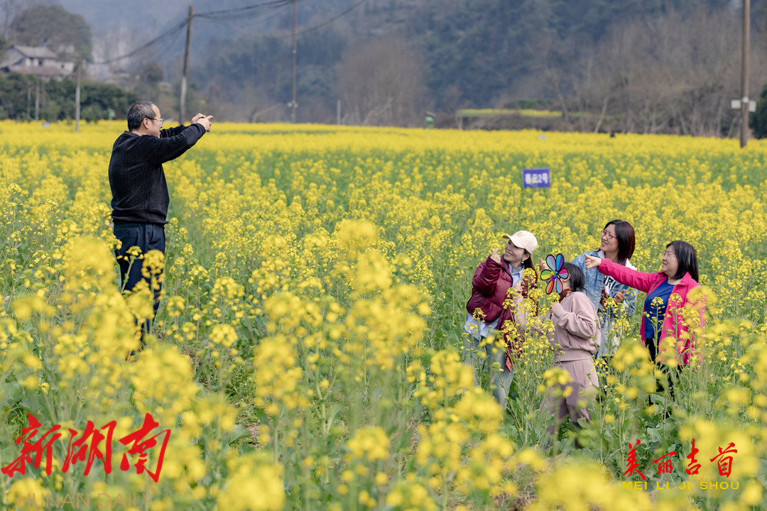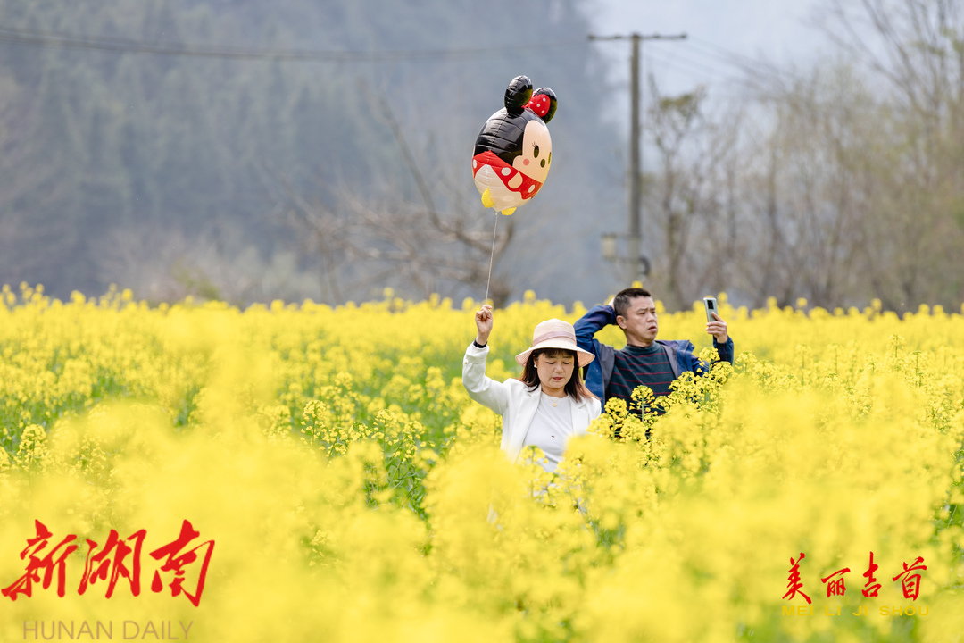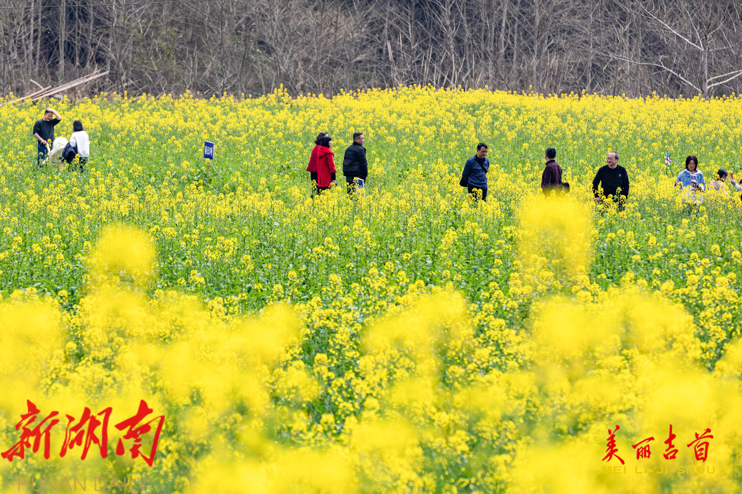 3月9日,吉首市矮寨镇大兴社区夯腊,连片的油菜花竞相开放、美不胜收,吸引不少游人前来踏春赏花,在油菜花海中静享春日里的花开烂漫、美好时光 。