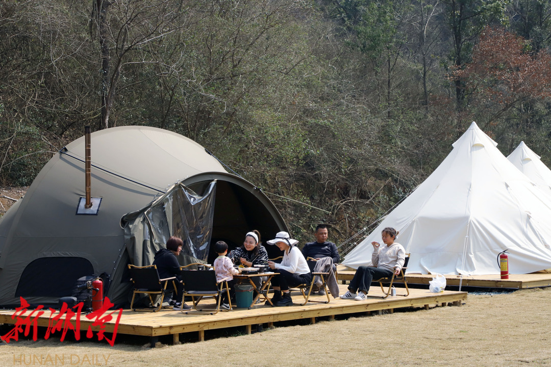 3月12日,走进位于长沙县安沙镇黄桥村的走吧去野·河谷露营基地,山野竹林、青青草地上,点缀着各式各样的帐篷,吸引不少游客慕名而来体验游玩,大家一起露营烧烤,享受天然舒适。“早就在小红书刷到了很多露营达人推荐这里,今天终于来亲身体验了。”前来露营的游客杨柳说。