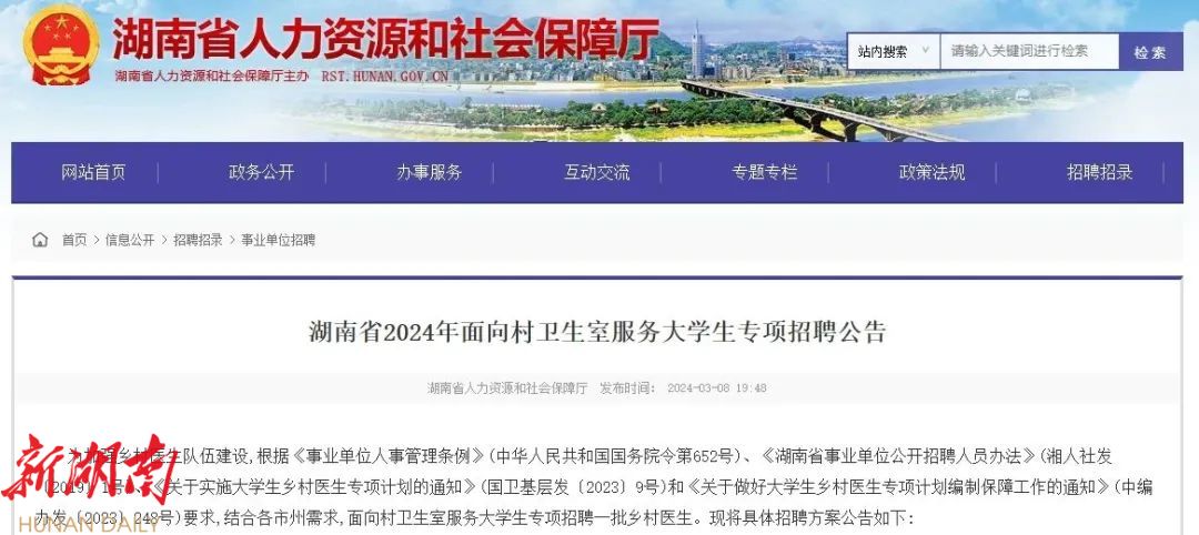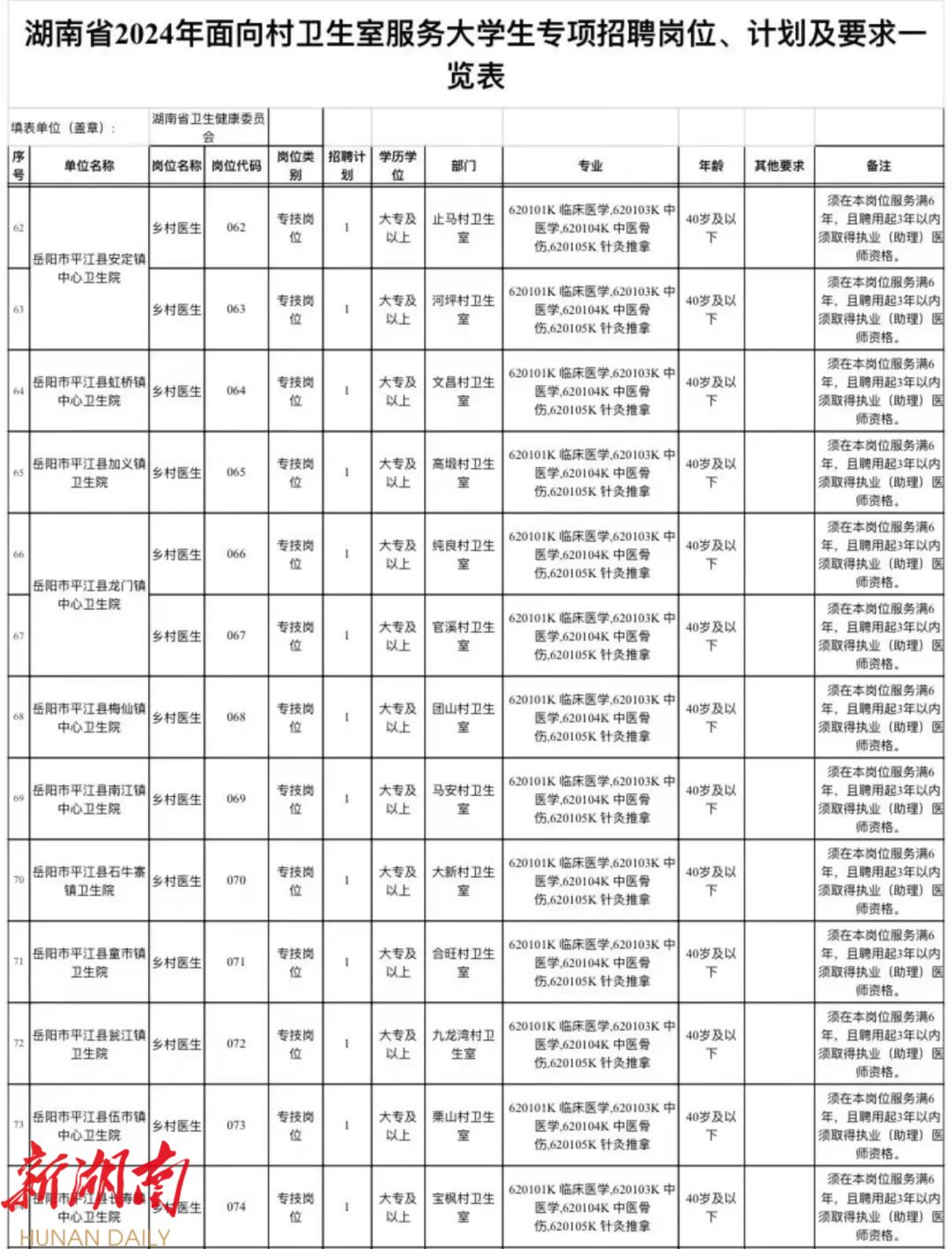 本次招聘范围为湖南省按照大学生乡村医生专项计划招录的2023届高校毕业生,以及2020年至2022年通过“医学专业高校毕业生免试申请乡村医生执业注册政策” 进入湖南省村卫生室服务的大学生,计划招录109名,平江计划招录13名,均为专业技术岗位,服务于村卫生室。