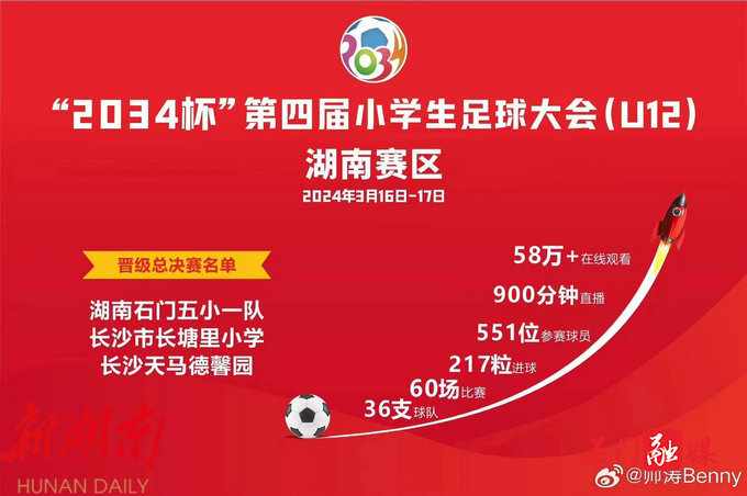 湖南日报·新湖南客户端3月18日讯(通讯员 覃业彦 康洁)3月17日下午,长沙体育新城足球场传来喜讯,石门五小足球队从湖南36支球队中挺进3强获得“2034杯”第四届小学生足球大会决赛名额。其中20号队员冯俊宁获得湖南赛区MVP。