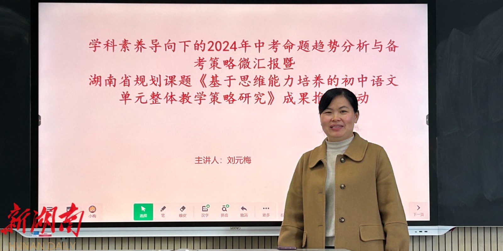 会上,特邀正高级语文教师、湖南省网络名师工作室主持人刘元梅为老师们答疑解惑,她开设了题为《学科素养导向下的2024年中考命题趋势分析与备考策略研究》的微讲座,从“双减”背景到新课程标准,从命题改革到历年中考题型,逐一进行剖析梳理,为老师们精准把握2024年中考命题思想、提高复习备考实效,提供了操作性较强的中考备考应对策略。