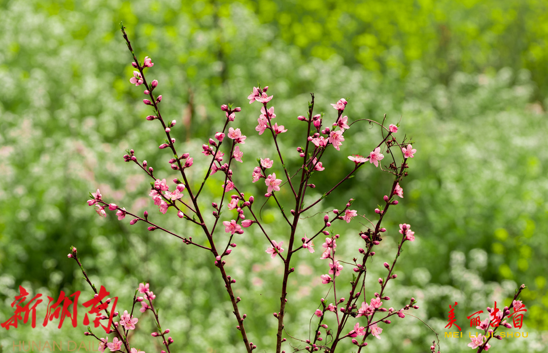 桃花、梨花、紫荆花一同盛放,粉白镶嵌在绿色山间,宛若一幅多彩的油画。