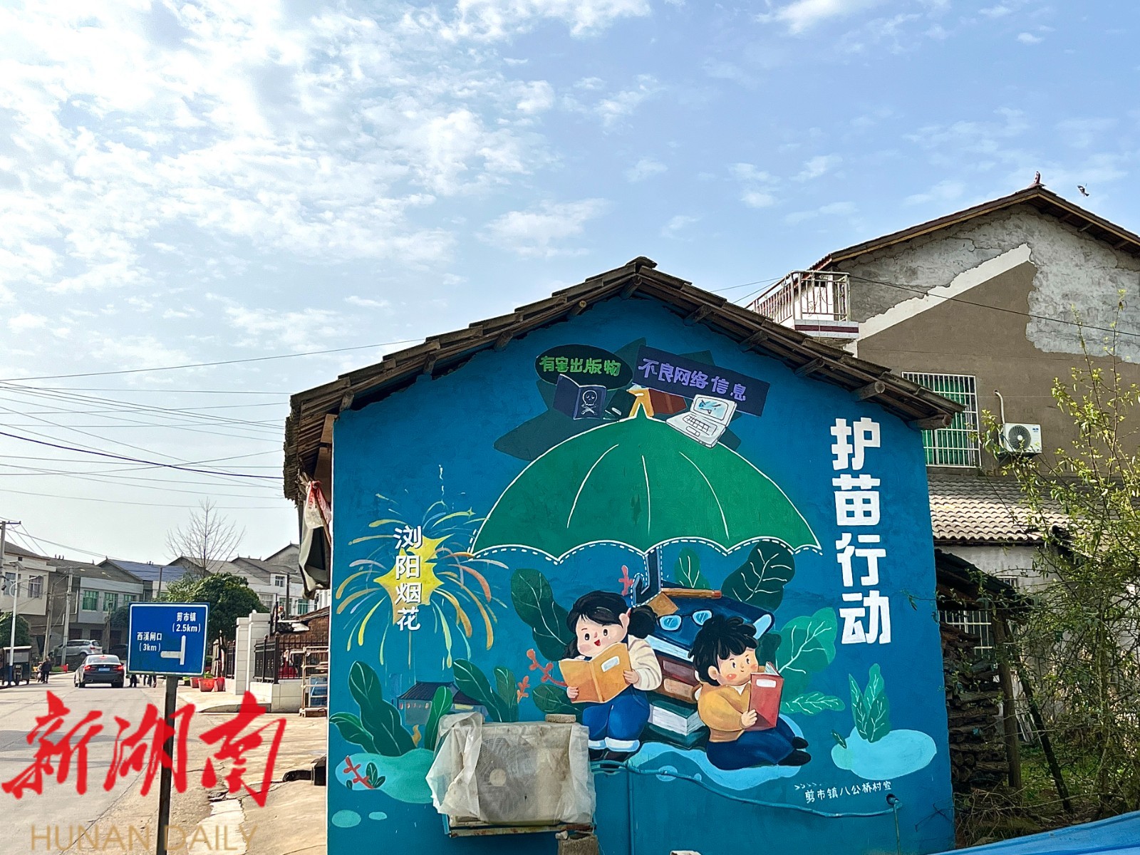 墙绘作品内容包含版权保护、文明上网、文明礼貌等,多彩的墙绘与远处蓝天白云相映成趣,在美化村容村貌的同时,发挥着艺术作品文化宣传的“软”作用,进一步提升了“扫黄打非”的宣传效果,成为了乡村“未成年人保护”与“扫黄打非”的宣传亮点。