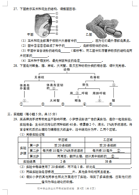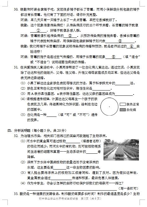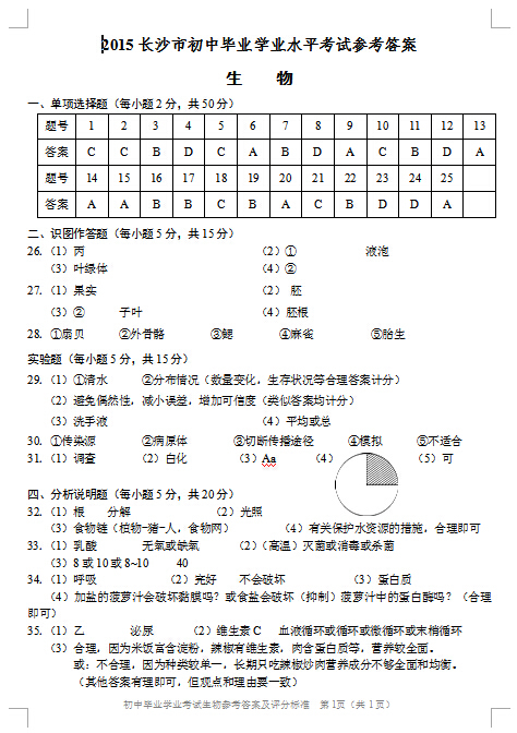 生物A卷丨无线湖南权威发布2015长沙中考试卷答案