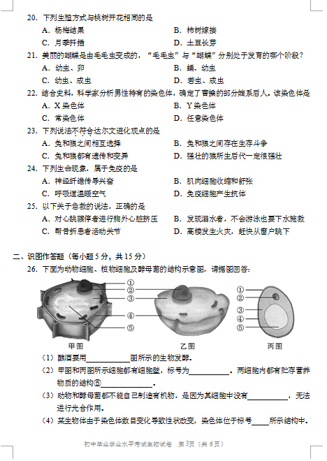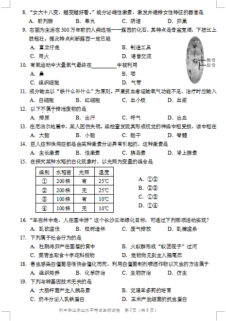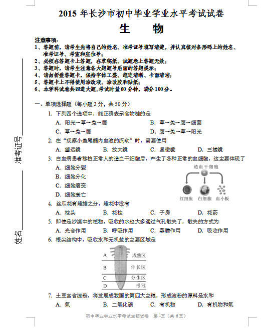 以下是2015长沙中考生物A卷试卷及参考答案:
