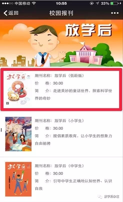 扫描二维码进入下图页面,《放学后》共低龄版、小学生、中学生三个版本,自愿订阅的学生,可根据本学期就读的年级选择需要订阅的版本,点击订阅(以低龄版为例)。