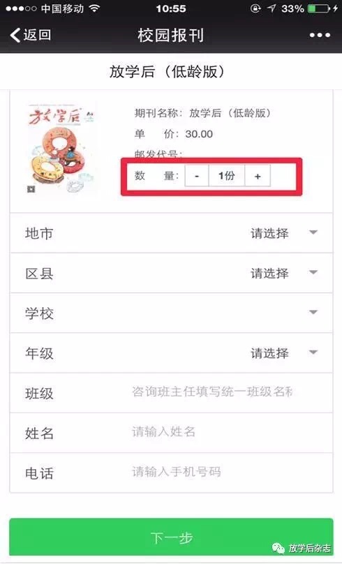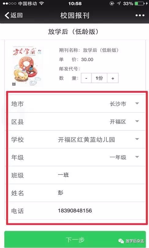 选择订阅份额后,填写订阅信息。选择学校所在的地市、县(区)、学校名称、年级,姓名电话信息。点击“下一步”。