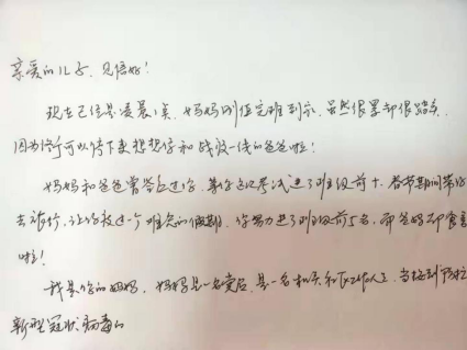 亲爱的儿子,妈妈当前的工作繁、多、杂、全,爸爸的工作要求非常严格,当你的父母都选择成为疫情中的“逆行者”时,希望你能理解我们、支持我们,更加希望你能从中学会担当敢为人先。
