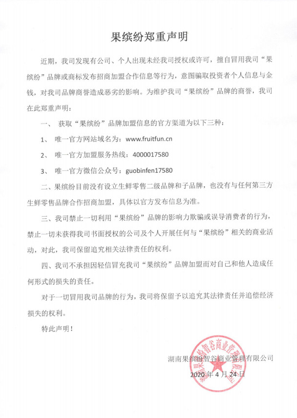 近期,我司发现有公司、个人出现未经我司授权或许可,擅自冒用我司“果缤纷”品牌或商标发布招商加盟合作信息等行为,意图骗取投资者个人信息与金钱,对我司品牌商誉造成恶劣的影响。为维护我司“果缤纷”品牌的商誉,我司在此郑重声明: