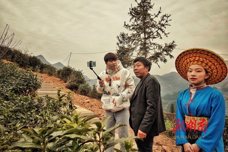 最后一站是谭德友经营的虎久雾语茶厂。老谭的小女儿小霞身着瑶族服装上镜带货,直播间的气氛顿时变得热烈起来。一旁的老谭提议:“我带你们去山上看看我的茶园!”一路上老谭不断通过直播向网友们介绍茶文化,引得网友们纷纷下单。